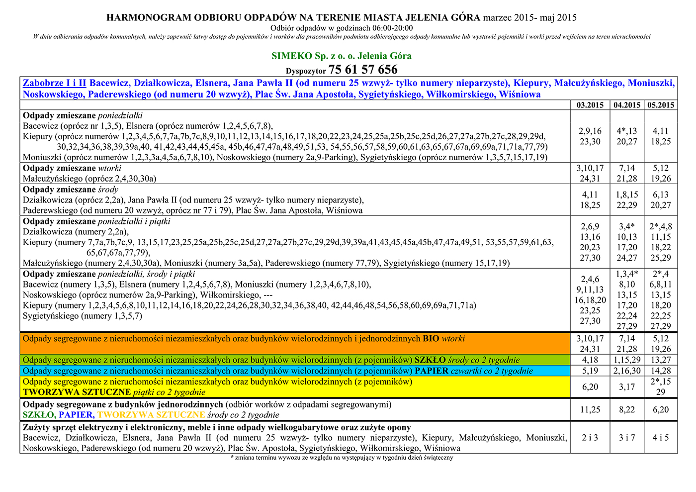 - Harmonogram odbioru odpadów na terenie miasta Jelenia Góra marzec - maj 2015r.